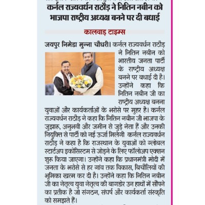 कर्नल राज्यवर्धन राठौड़ ने नितिन नबीन को भाजपा राष्ट्रीय अध्यक्ष बैन पर दी बधाई